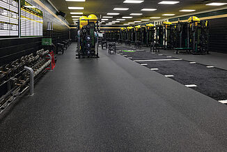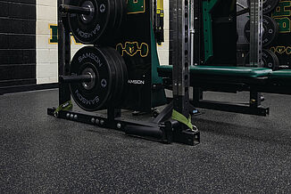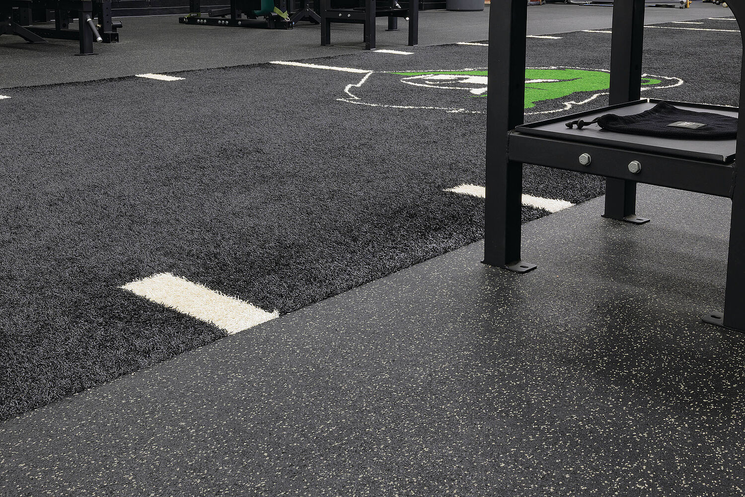 The space is built on REGUPOL aktivplus premier, a 3/4" thick premium rubber flooring system designed for high-impact strength training environments. Its increased thickness and density provide enhanced impact protection for heavy lifts, while still delivering the stability athletes need for controlled, powerful movement. The result is a surface that feels solid underfoot without sacrificing the shock absorption required to protect both athletes and equipment. The flooring creates a unified training environment that allows athletes to transition seamlessly between lifting, conditioning, and functional movements. This continuity not only improves flow within the space, but also reinforces how the room is used, as a complete performance system rather than isolated zones.