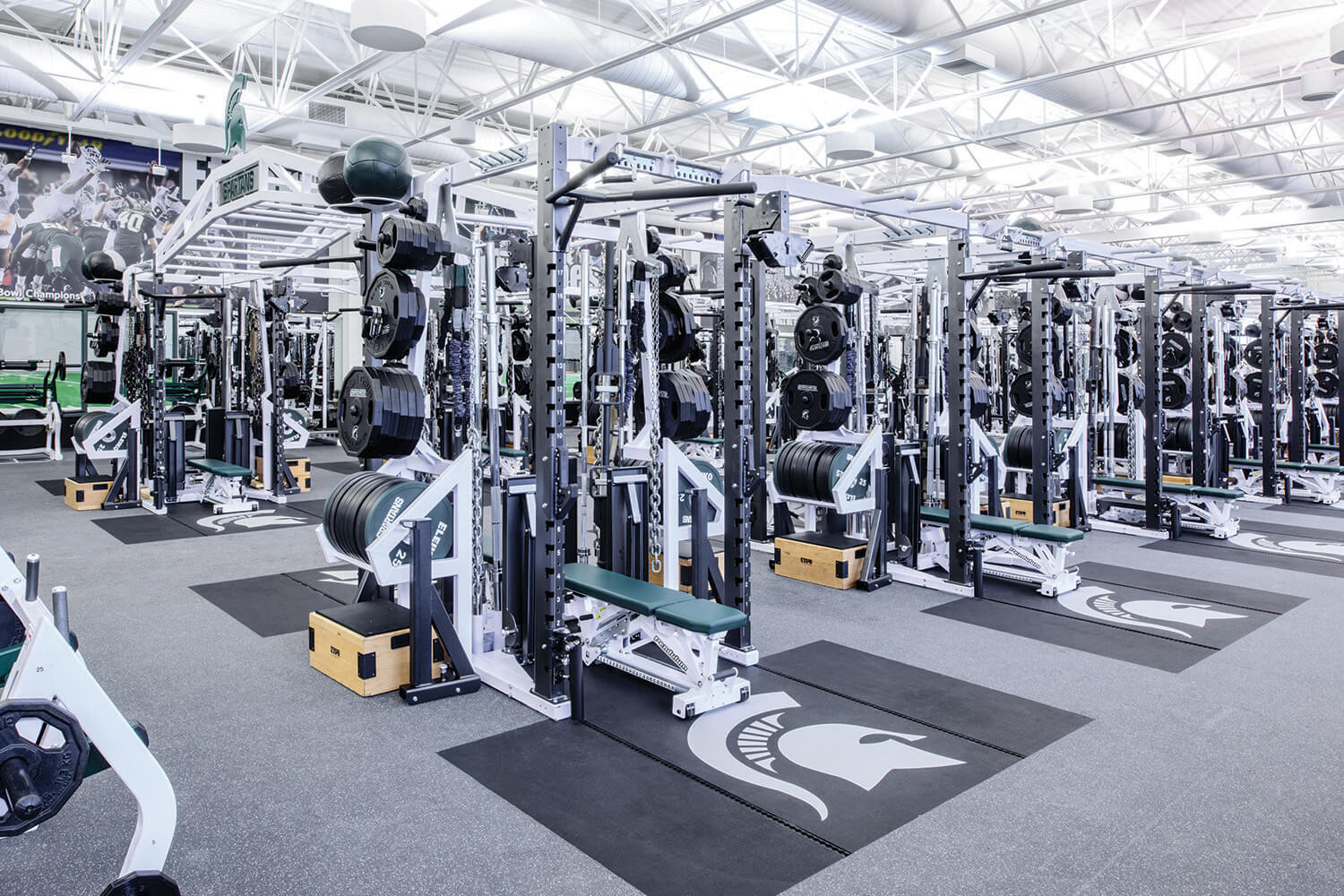 REGUPOL aktivpro roll not only enhances performance but also protects the structural integrity of the facility by absorbing and distributing the impact of heavy weights and rigorous activity. Its low-maintenance design and customizable options allowed Michigan State to integrate its iconic Spartan branding seamlessly into the facility, creating a visually striking and functional training space. In addition to aktivpro roll, the facility is outfitted with REGUPOL crash in key areas, providing an extra layer of protection for high-impact zones where athletes perform heavy lifts or drop weights.