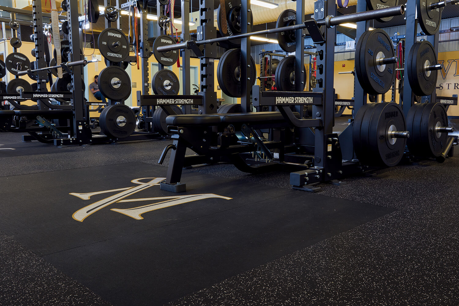 The 4,200 square feet facility now has 1" thick performance flooring with 16 Olympic inlaid platforms, along with precision jet water cutting to brand the floor with the Millersville logo transformed the facility into a work of art. Aktivpro roll high-performance floor is the perfect choice to withstand the constant foot traffic as well as take heavy hits of over 450 student-athletes.