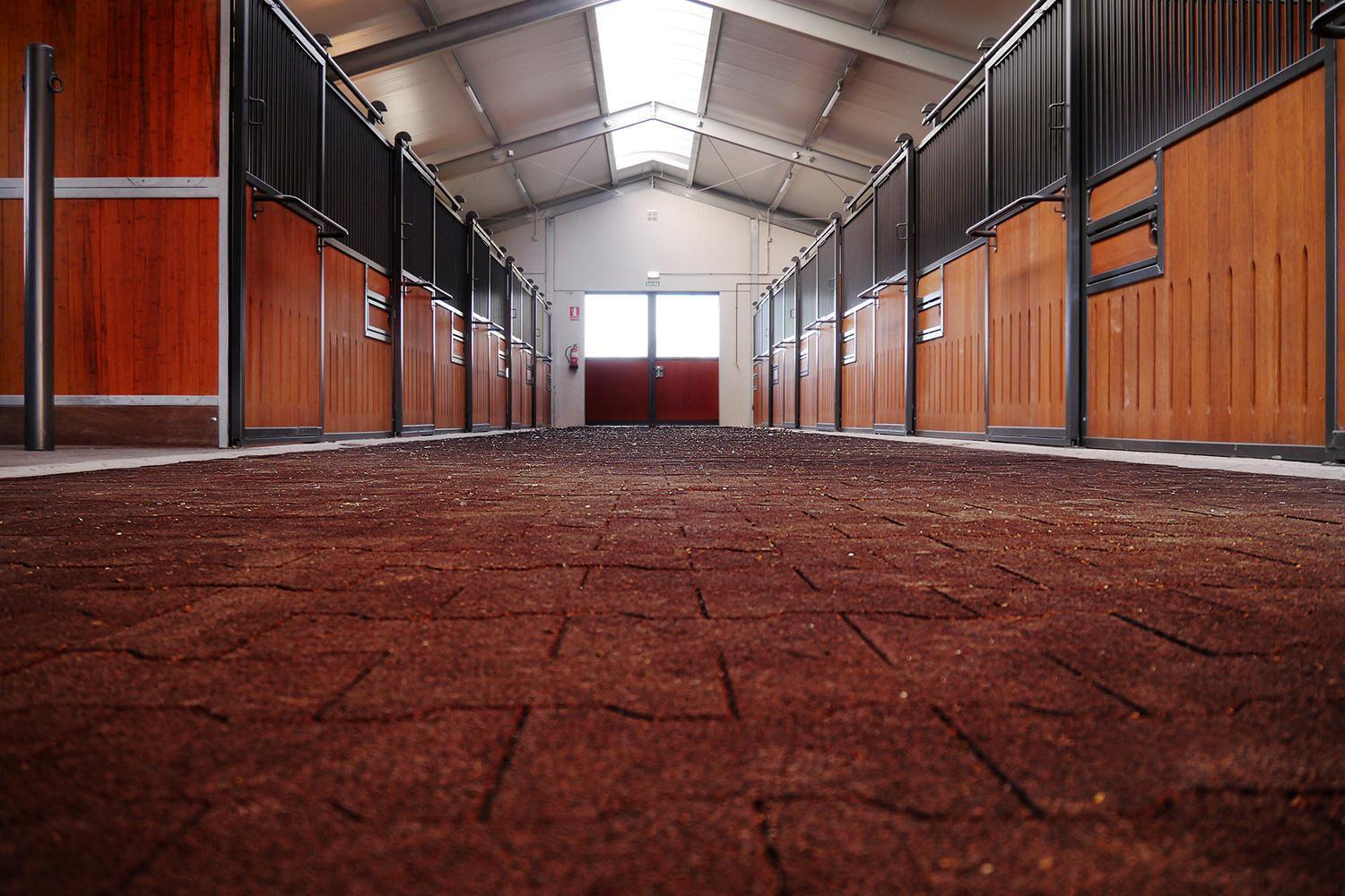 The interlocking pavers in the stable aisle and horse walker at Finca Maeza have the name REGUPOL equiline walkway - a good choice for areas where horses walk regularly. The elastic material deadens the sound of hooves and creates a walking surface that’s quiet and at the same time gentle on the horses’ joints. Highly robust and easy to clean, our REGUPOL interlocking pavers are perfect for this facility.