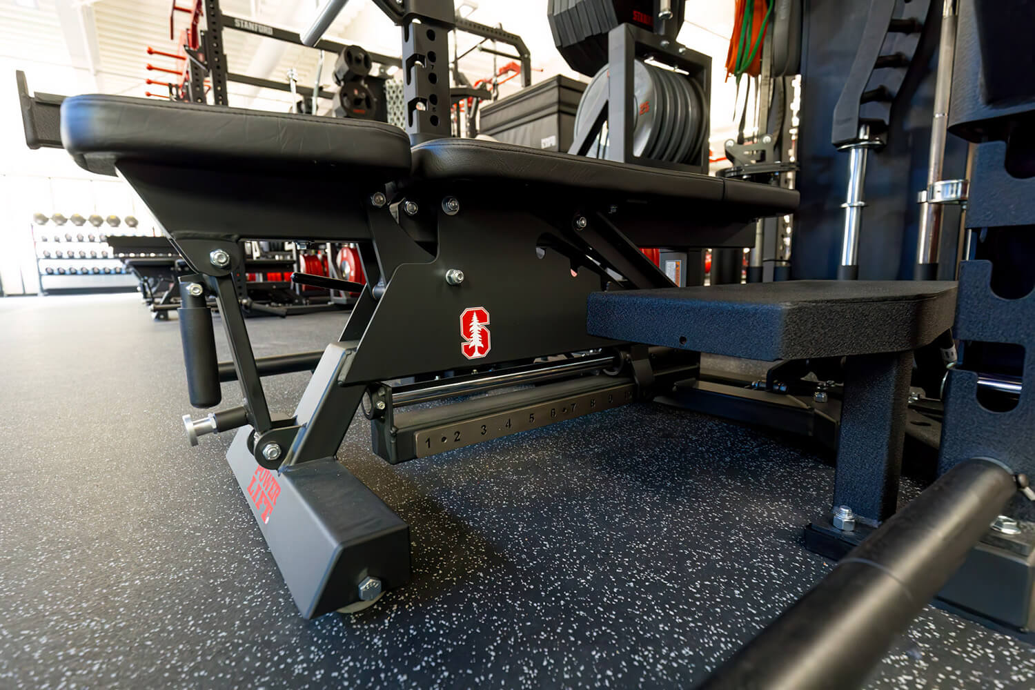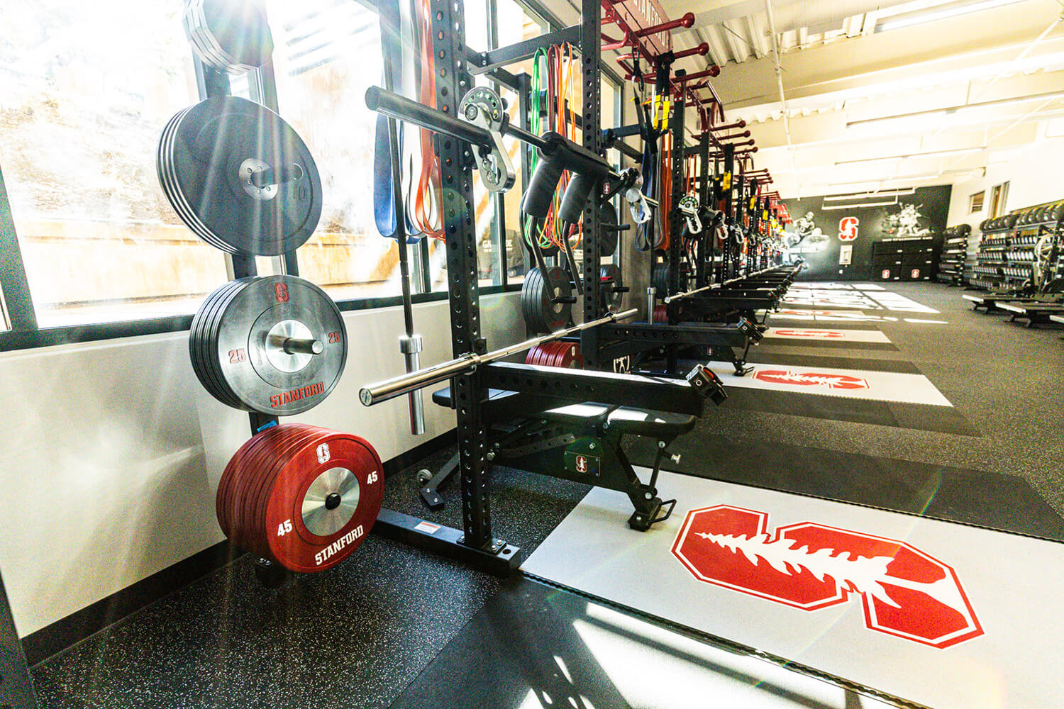The REGUPOL aktivpro roll flooring is a customizable, multi-layered athletic flooring, allowing the university logo to be inlaid seamlessly into the flooring system. This flooring system is known for its durability, stability, and shock absorption, making it suitable for activities like Olympic weightlifting and high-performance training. REGUPOL crash is an ultra-dense rubber flooring specifically designed for "drop-zones" of inlaid platforms and high-impact areas. It reduces noise, reverberation, and barbell bounce-back, prioritizing athlete safety and well-being. Stanford University is renowned for its athletic achievements, holding 163 total national championships and 134 national NCAA team championships. Selecting REGUPOL flooring was the clear choice for a university focused on top-tier athletic performance.
