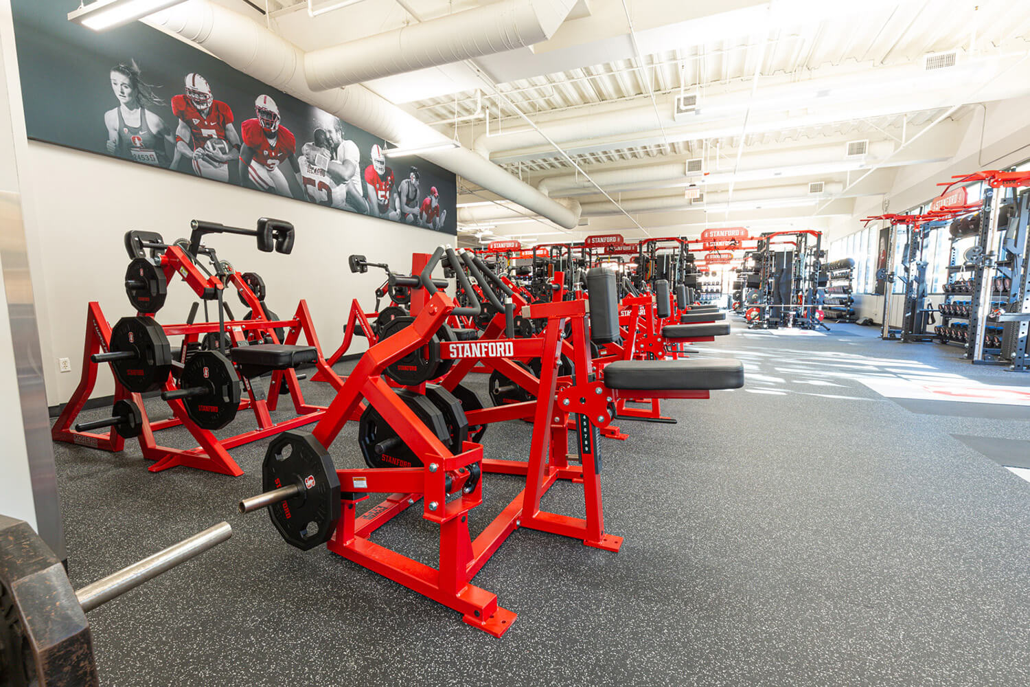 The renovation of the Sports Performance Center at Stanford University's Arrillaga Family Sports Center involved the installation of REGUPOL flooring. Completed in 2023, the project encompassed over 16,000 square feet and used a combination of REGUPOL aktivpro roll and REGUPOL crash flooring products. The renovation included the installation of inlaid platforms with REGUPOL crash drop zones. The color scheme incorporated Gray Hound, custom Cardinal Red, solid Gray, and Black.