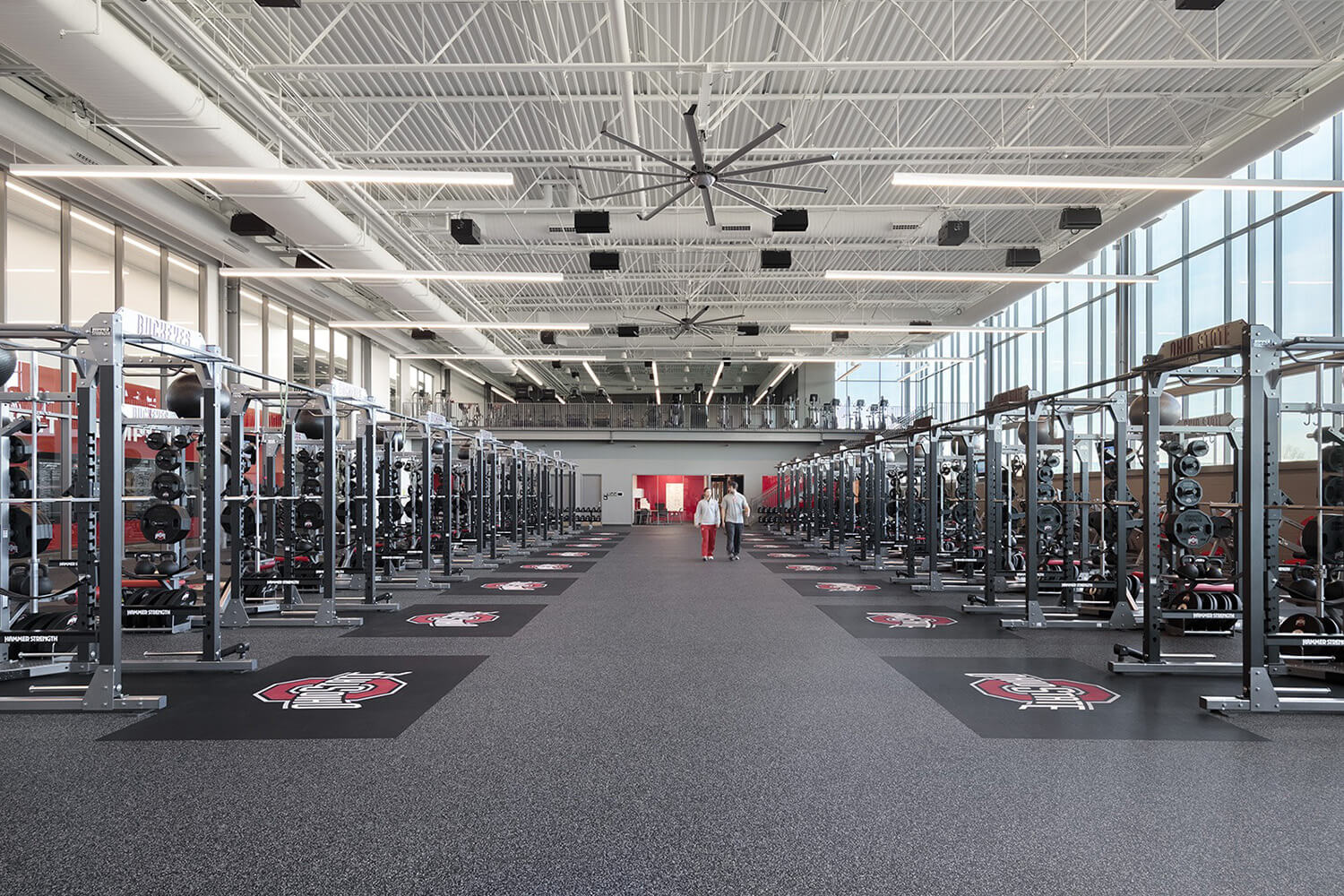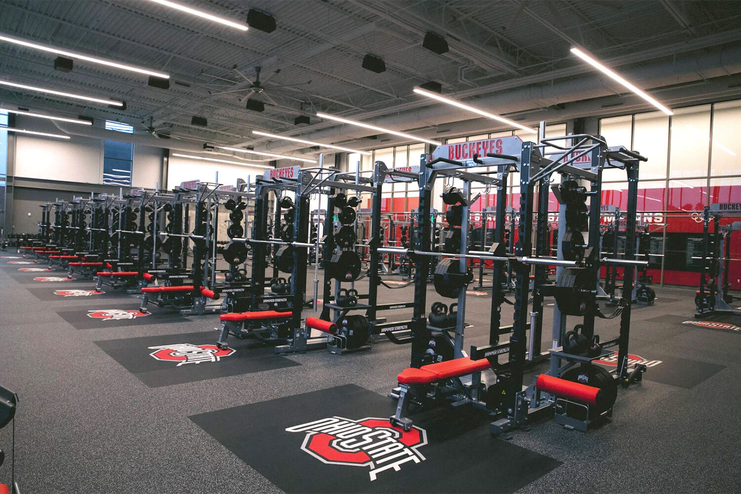 The choice of Thunder Gray as the primary color for the flooring, complemented by custom solid red and black accents, creates a visually appealing and cohesive aesthetic. The incorporation of high-quality materials, advanced design elements, and expert installation transformed the Schumaker Complex into a cutting-edge training environment for Ohio State athletes.